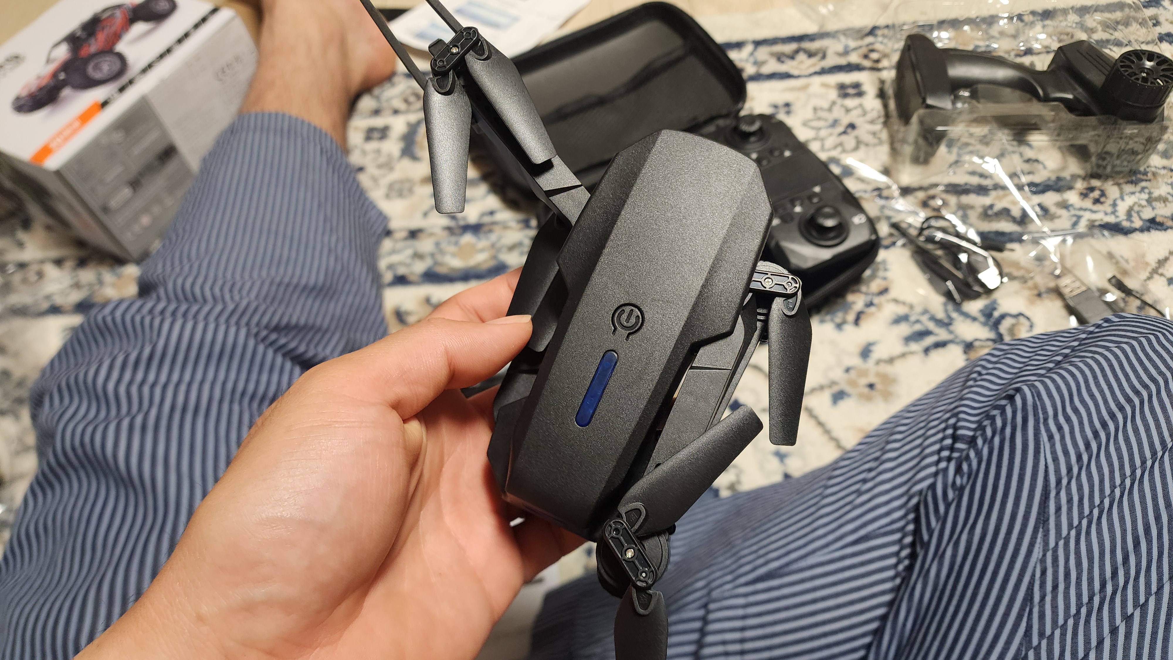 증상은 날개가 대각선으로 2개씩만 회전한다. 리모컨을 막 조정하면 다시 반댓쪽 날개 2개가 돌아가고 멈추고를 반복, 어쨌든 그 후로 날지 못했다. 더웃긴것은 아이들과 함께 장난으로 내가 드론을 쥐고 있고 하늘 위로 던졌는데 몇번 날기를 반복하기도 하고, 바닥에 한번 떨어진 반동으로 다시 정상 작동하기도 하고, 그러나 공원에서 날리는것은 너무 위험했다. 마침 그 시간대에 아이들이 많지는 않아서 날렸지만 컨트롤이 되지 않는 비행체를 공공장소에서 날리는것은 바람직하지 못하다.