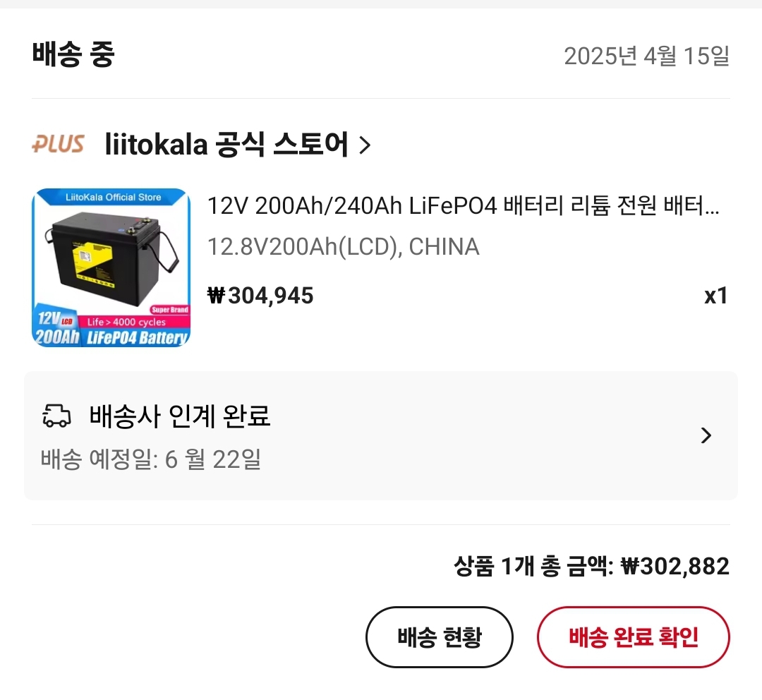 그리고는 카라반 전기를 업글하고싶어서 600ah짜리 딱 지금 남는공간에 들어맞는 인산철을 100정도 주고 구입할까하다, 너무 무리하는것 같아 꾹 참고참다가, 그래도 중국인산철계의 애플이자 테슬라격인 리이또칼라 제품 200ah으로 30 만원에 결제 성공! 해외결제까지 되는 너란 포인트카드, 증말 사랑한다.