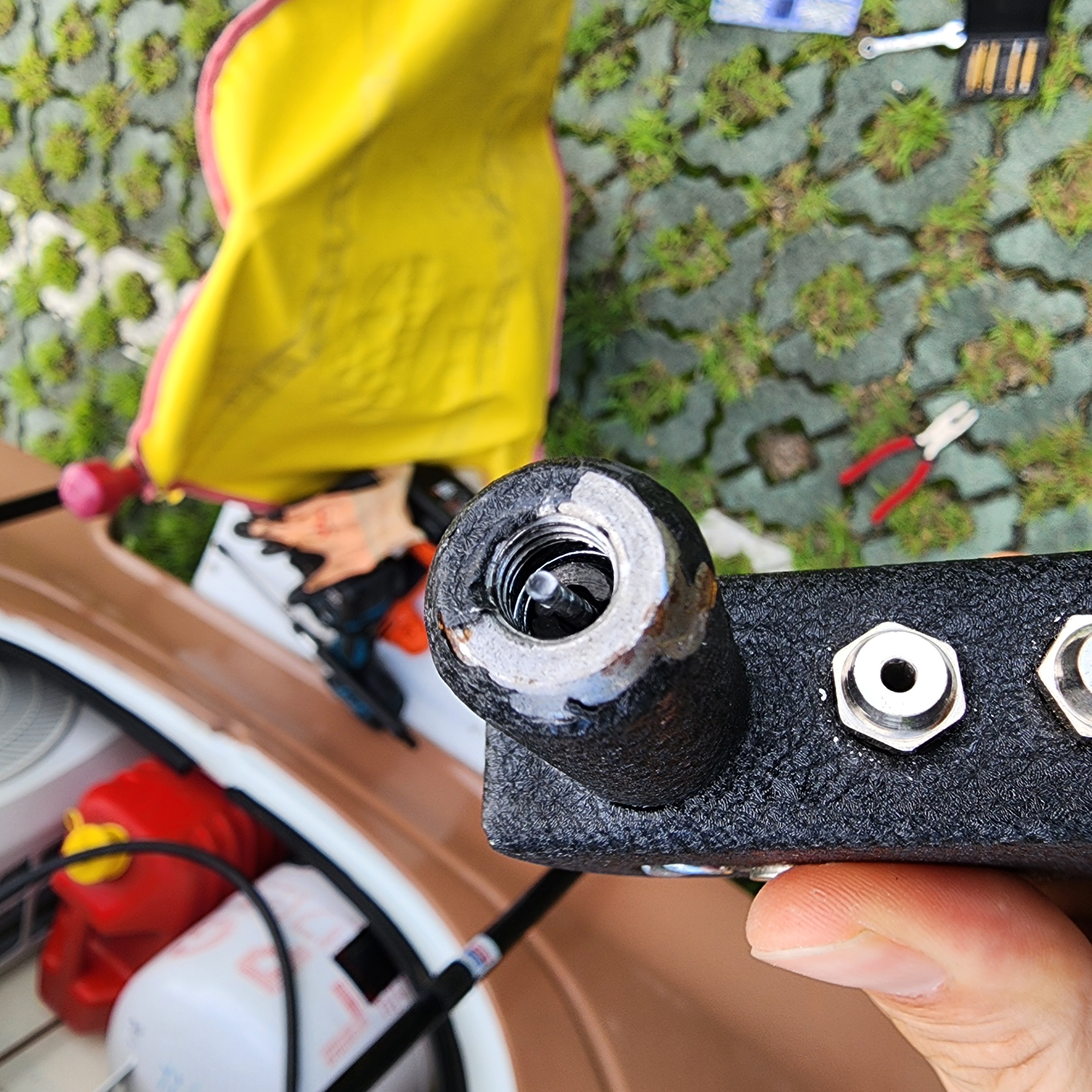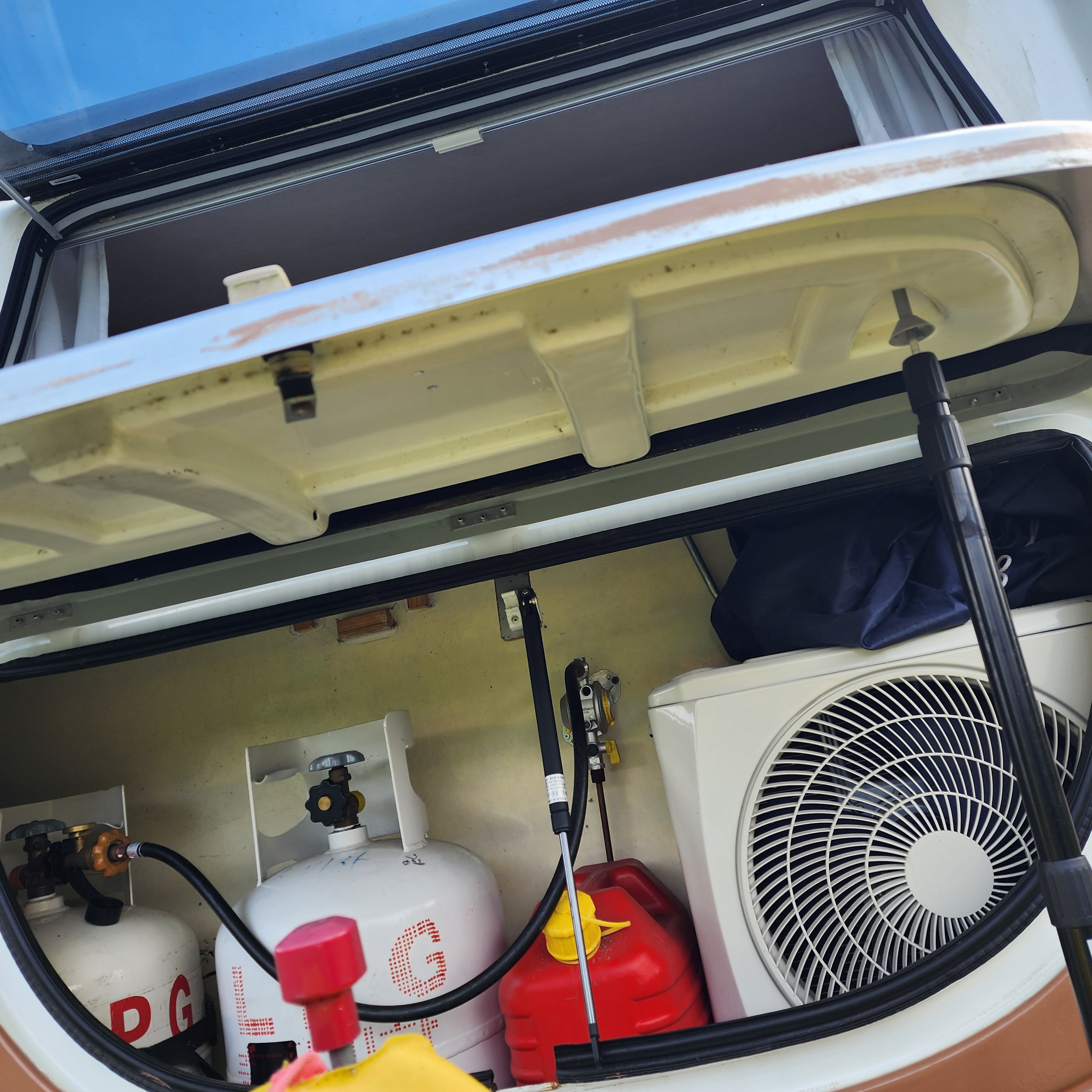 비가 너무 많이내려서 도저히 전면수납함 가스쇼버 작업은 안될 것 같고, 마침 멀티탭도 가져왔겠다. 미루고미루고 미루어두었던 후면 대형창 지지대 파손부 수리를 시작했다.