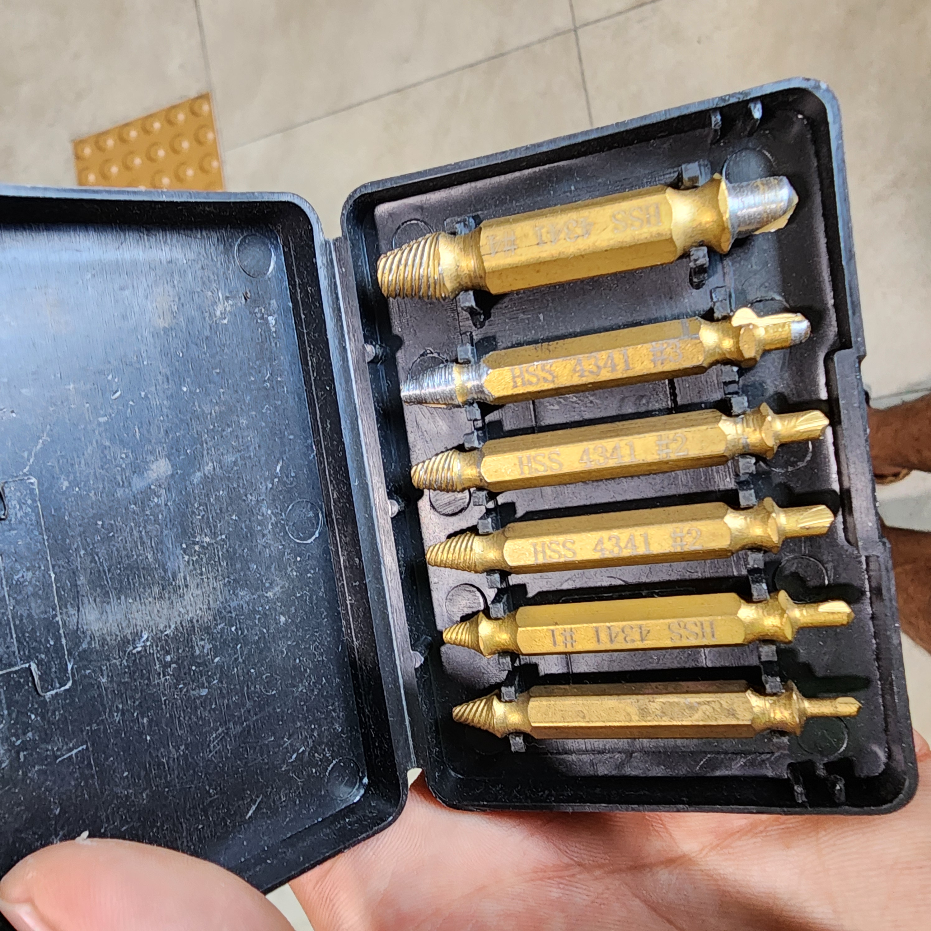 교회를 다녀와서 다시 만반의 준비를 갖춘다. 유일하게 힘을 받을 수 있는 지지대 부분 철편을 뚫어야 하는데 가지고 있는 드릴 비트들을 다 동원해봐도 꿈쩍도 안하는것. 뭘로 뚫어볼까 고민하다가, 예전에 사두었던 역탭 비트를 다시 꺼내들었다.
