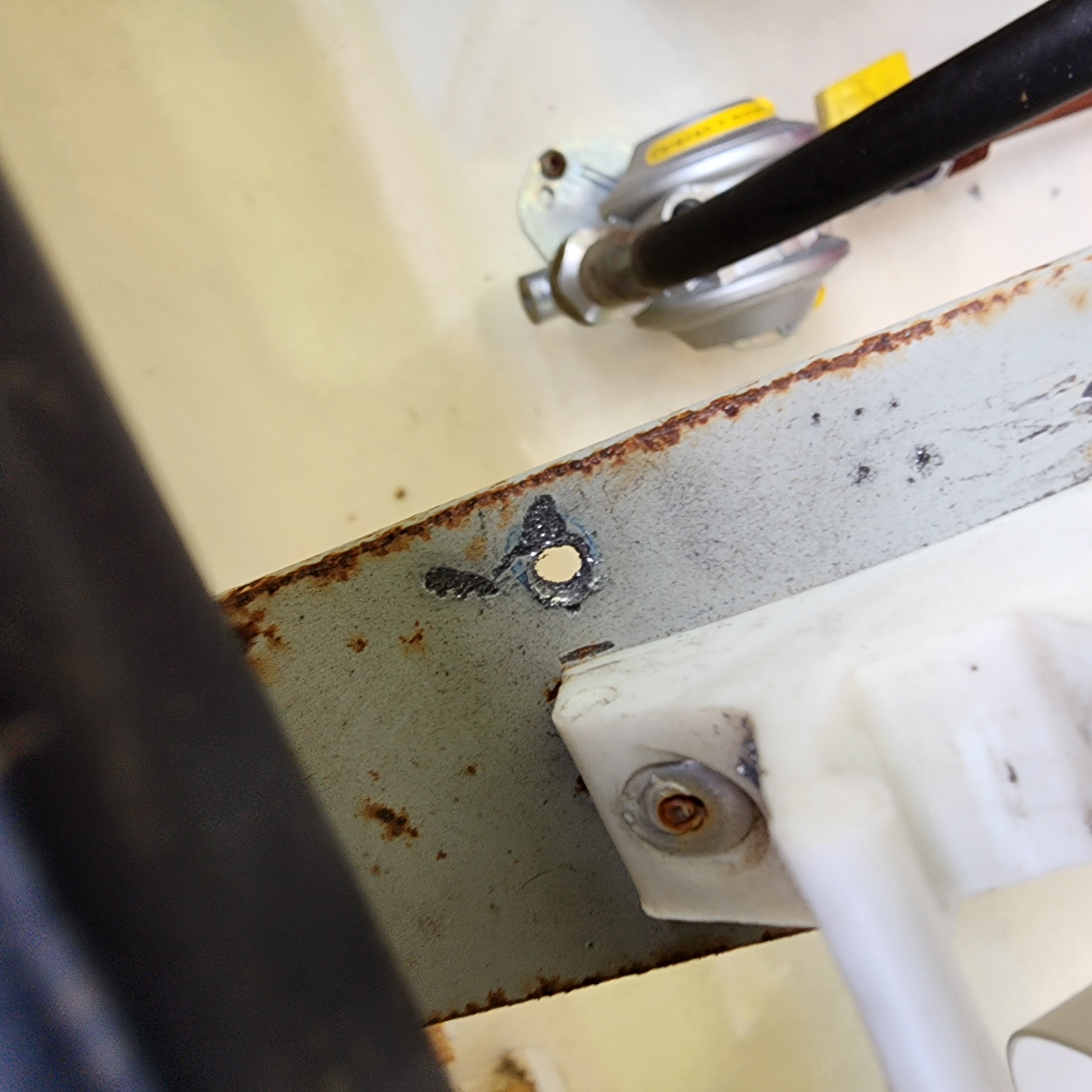 이 가스쇼버 작업이 이상하리만치 진도가 안나간 이유는 바로 이런 문제들이다. 경첩이 사라지고, 철판이 안뚫리고, 리벳건이 고장나고,, 결국 수분간의 삽질끝에 리벳을 오히려 안쪽으로 밀어넣으니, 꽉 물렸던 리벳 꽁지가 뒤로 빠지면서 정상 작동, 나중에 느낀건데, 리벳을 한 번 물고 난 다음에 반대방향으로 꺽 하고 한번 풀어줬어야했나본데, 그걸 안해고 계속 물리상태에서 뽑으려고만 했던듯. (리벳건 사용경험이 많지않아서 어색하다)